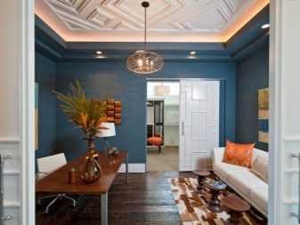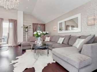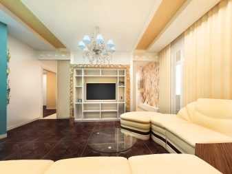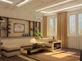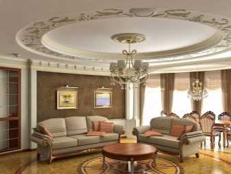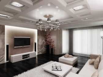 Для отделки потолка можно использовать лепнину. Но она не должна иметь четких линий и прямые геометрические формы, чтобы вписаться в современный интерьер зала. В этом случае все потолки оформляют светлыми оттенками – белыми, молочными, бледно-желтыми.