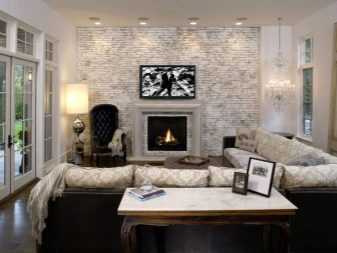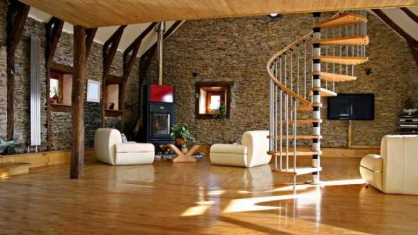 В зале можно обустроить диванную зону и камин. Он внесет уют в помещение и наполнит его теплом. Стены в этой зоне отдыха часто отделывают кирпичом или камнем. Для пола лучше всего подойдет дощатое покрытие.