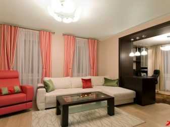 Так как помещение будет состоять из нескольких зон, нужно обеспечить максимальный доступ света, для чего рекомендуется увеличить размеры окон, использовать в дизайне светлые оттенки. Увеличить площадь комнаты можно с помощью различных способов перепланировки: например, снести стену на кухне, присоединить балкон.