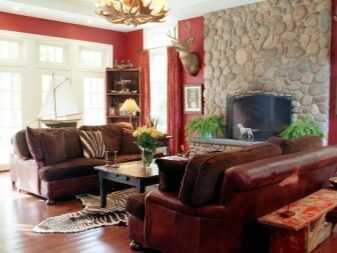 Как элемент декора на потолке можно закрепить деревянные балки. В целом, помещение лучше оформить в природных коричневых оттенках с натуральными древесными текстурами и узорами. Диван лучше подобрать бежевый или шоколадного цвета. Лучше, если его обивка будет мягкой, будто бы бархатистой. Прекрасно впишется в такой интерьер и кожаный диван.
