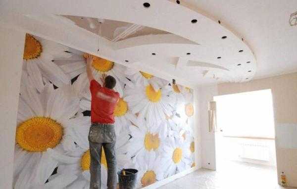 — Оклейка обоями. Материал распространен по причине богатого разнообразия фактуры, рисунков и цветовых гамм. Перед тем, как сделать ремонт в зале, подбираются в первую очередь именно обои, так как они будут покрывать большую часть всех внутренних поверхностей (потолок, стены).