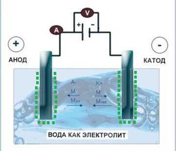 - Использование электролиза. Как обезжелезиватель можно использовать электролизер. Стержни, изготовленные из углерода, погружают в жидкость и подключают к сетевому выпрямителю большой мощности. При протекании постоянного тока через раствор солей на стержне, соединенном с минусом источника питания – катоде, оседают восстановленные металлы в виде тонкой корки. В помещении для электролиза нельзя пользоваться открытым огнем и курить, необходимо постоянно поддерживать приточно-вытяжную вентиляцию. На полу возле электролизера необходимо положить резиновый коврик.