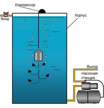 Это наименее затратный и самый простой в реализации способ обезжелезивания колодезной воды. Систему, изготовленную своими руками, дополнительно оснащают резервуаром, объемы которого соответствуют суммарному суточному потреблению всех домочадцев. Метод имеет как преимущества, так и недостатки.
