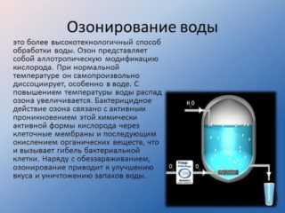 При пропускании озона через воду двухвалентный оксид железа окисляется до трехвалентного – ржавчины, которая оседает на дно. Озон, в отличие от хлорной извести, не растворяется в воде и не изменяет ее химический состав. Сейчас он применяется на Мосводоканале вместо гипохлорита натрия. Преимущества – вместе с очисткой от металлов происходит дезинфекция, озон не изменяет химический состав и свойства. Недостатки – большие затраты электроэнергии на производство озона.