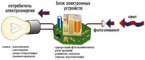 Несмотря на кажущееся разнообразие представленных на рынке моделей фотореле, принцип действия у них во многом схож. Главным узлом в них является фоточувствительный элемент, способный изменять свои электропроводящие свойства в зависимости от интенсивности падающего на него светового потока. Чаще всего в качестве фотоэлементов выступают либо фотодиоды, либо фототранзисторы. Фотоэлемент подключается к управляющей плате, основное назначение которой – контроль параметров светочувствительного устройства. Как только уровень освещения изменится и из-за этого поменяются параметры фотоэлемента, управляющая плата подает напряжение на исполнительный механизм. В качестве последнего обычно выступают реле, позволяющие замыкать и размыкать провода цепи электроснабжения уличного освещения.
