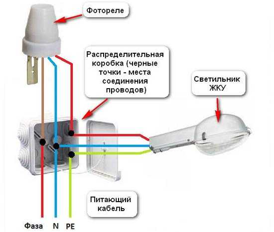 Подсоединение проводов выполняется через распределительную коробку для улицы. Она закрепляется рядом с фотореле.
