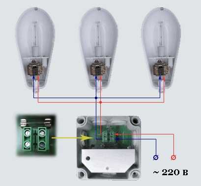 Если на выходе фотореле лишь только одна пара контактных клемм, то и в этом случае существует возможность управлять сразу несколькими лампами. Для этого достаточно подключить их к выходу фотореле параллельным способом.