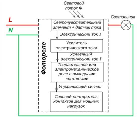 Основным элементом реле является фотодатчик, в схемах могут применяться фоторезисторы, диоды, транзисторы, фотоэлектрические элементы. При изменении освещенности на фотоэлементе соответственно изменяются и его свойства, такие как сопротивление, состояния P-N перехода в диодах и транзисторах, а также напряжения на контактах фоточувствительного элемента. Далее сигнал усиливается и происходит переключение силового элемента, коммутирующего нагрузку. В качестве выходных управляющих элементов используют реле или симисторы.