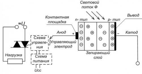 Фототиристоры предназначаются для деятельности в цепях постоянного тока. Изготовлен оптоэлектронным полупроводником, который обладает структурой обычного тиристора. Включается в работу от появления тока от светового потока, направляемого на светочувствительную матрицу элемента.