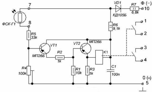 Схема фотореле фр-2 промышленного изготовления применяется для автоматического управления уличным освещением. Здесь также коммутационным устройством является реле К1. К базе транзистора VT1 подключены фоторезистор ФСК-Г1 с резисторами R4 и R5.