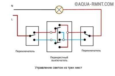 Схема управления освещением с двух мест с помощью проходных выключателей
