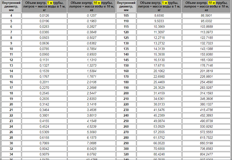 - Рассчитайте объем жидкости, которая имеется в одном погонном метре. Перемножьте площадь и толщину стенки;