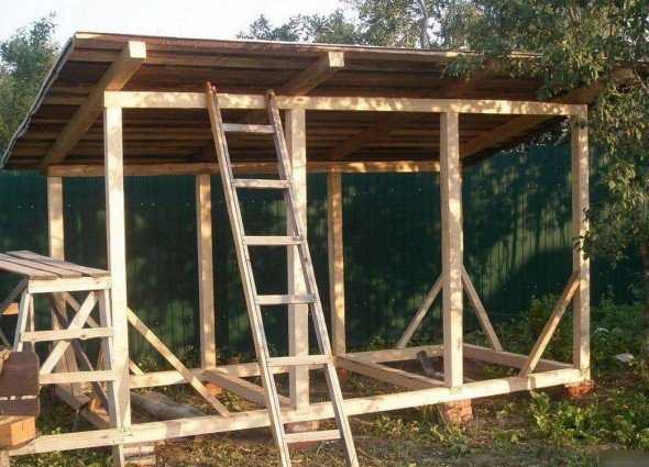 - Для начала из профильной трубы нужно сварить каркас навеса. Мало того, это не просто навес, а настоящий павильон с полом, конструкция которого выглядит довольно серьезно. Начать нужно с пола – выварить прямоугольник нужного размера, усилить его массой перемычек, которые одновременно будут выполнять функцию лагов для дощатого настила. Потом по углам получившегося основания установить стойки – сверху них собрать еще один прямоугольник, расположить который нужно под наклоном. Это крыша, а вернее навес, который так же, как и пол, нужно будет усилить перемычками, которые в данной ситуации послужат стропилами – впоследствии к ним будет производиться крепление кровельного материала.
