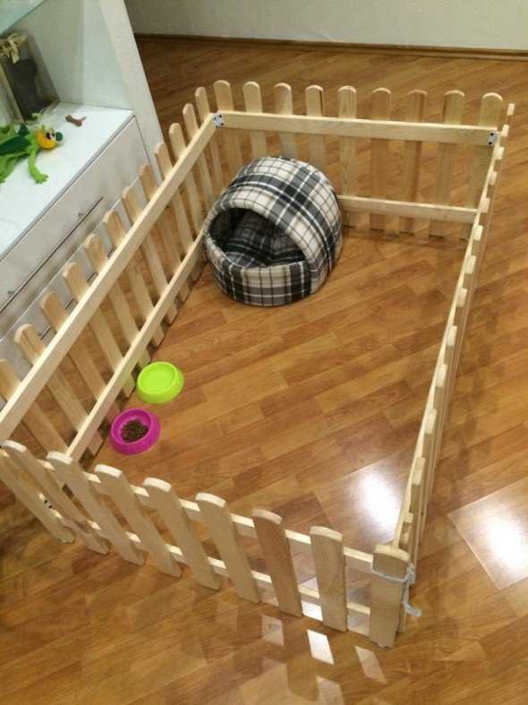Вольеры для содержания собак в квартирных условиях дорого стоят. Их размеры индивидуальны и подбираются в соответствии с габаритами питомца. Чтобы не тратить лишних денег, можно смастерить эту конструкцию своими силами. Для маленького щенка достаточна высота 40–45 см и площадью до 100 квадратных см. Для мелких пород собак можно изготовить комнатный домик высотой около 80 см, площадью не менее полутора метров (если площадь квартиры позволяет, можно сделать и больше). Меньшую площадь вольера делать не стоит, так как вашему четвероногому любимцу необходимо пространство для сна, игр, туалета, миски с кормом и водой.