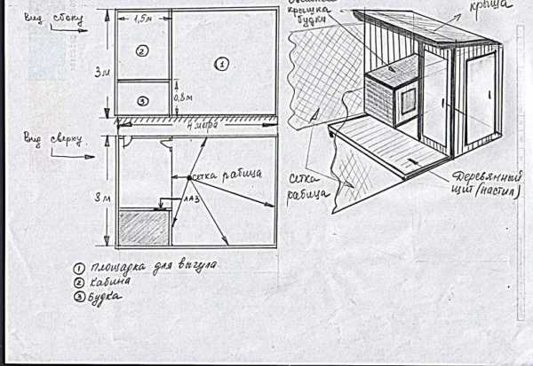 Главное – учтите, что план «резиденции» для пушистого сторожа основывают на расположении зимника. Возьмите в расчет 4 метра постройки, и отведите 1.5 метра под будку. Столько же оставляют под помост. Для открытой площадки достаточно 1 метра.