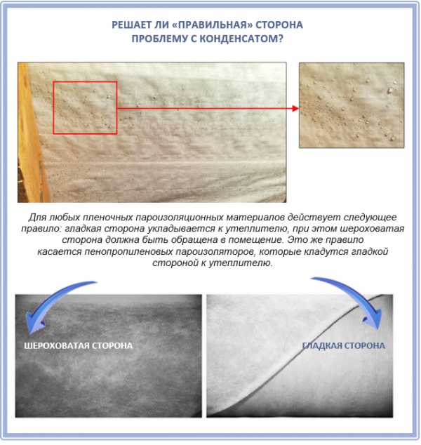 Посмотрите внимательно на схему: вы видите, где конденсат появляется в грамотно обустроенной кровле? Правильно, не со стороны помещения, а совсем немного со стороны кровли, на той стороне утеплителя, и его легко выводит ветрозащитная антиконденсатная пленка или мембрана. Но конденсат не должен появляться на пароизоляции, и никакая ее шероховатая сторона с ним не справится, т.к. у нее другая структура, и мы сейчас вам это докажем.