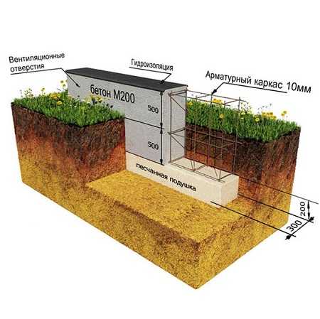 Специалисты рекомендуют при заливке ленточного фундамента оборудовать вентиляционные отверстия (не меньше 2-х, диаметром от 8 до 12 см) и технологические — для подключения всевозможных коммуникаций, размером превышающие внешний диаметр подключаемых коммуникаций. Поверх фундамента следует уложить слой гидроизоляции.