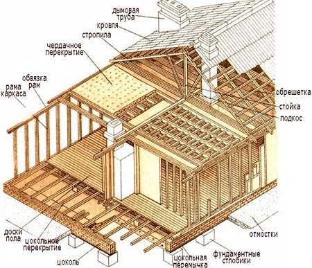 Как только фундамент и обвязка готовы, можно приступать к монтажу каркасных стен. Предварительно собираем рамы во дворе, на открытом пространстве; в противном случае, работу не выполнить. Расстояние между осями ровняем до 0,6 м. Если в стене предполагается проём, то увеличиваем не более чем на 0,4 м. Там, где рама будет примыкать к перемычкам, устанавливаем дополнительную стойку. Тут же можно проложить лаги для пола, брус берём с сечением 15 на 5.
