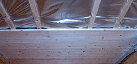 Для оборудования бесчердачной кровли можно применить настильный тип потолка, для этого на стропила или балки настилают шпунтованные доски, затем накладывают слой пароизоляции (фольгу в два слоя или техническую полиэтиленовую пленку).