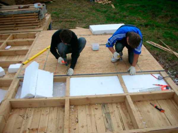 Переходим к внутренним работам и начнём мы с пола для предбанника. Необходимо помнить, что пол, как и стены, будет потребителем тепла, посему его тоже придётся утеплять. Сначала выкладываем черновой пол и делаем гидроизоляцию рубероидом или иным материалом. Потом утепляем пол тем же материалом, что и стены. Вновь кладём слой гидроизоляции и, наконец, чистовой пол.