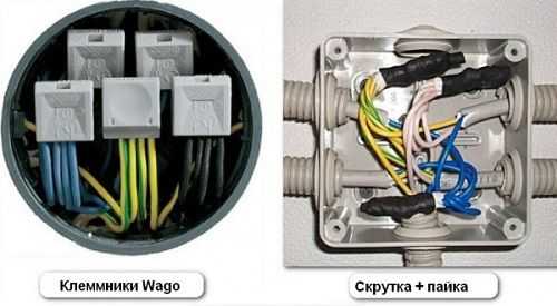 Существуют специальные зажимы для проводов (WAGО или болтовые). Зажимы WAGO неразъёмные, в них просто вставляются провода и закрепляются таким образом. Для болтовых зажимов нужно сперва выполнить скрутку, затем открутить болты в зажиме и вставить скрутку внутрь, затем плотно закрутить зажим.