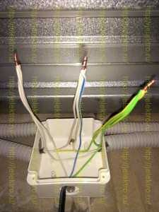 Заводим в предварительно встроенную в стену либо же закрепленную на основании (в зависимости от модели) распределительную коробку примерно 10 см провода. Снимаем с кабелей общую оболочку. Затем удаляем приблизительно 0,5 см изоляции с каждой жилы. В этом моменте ориентируемся по ситуации – счищаем столько изоляции, чтобы жилы можно было соединить выбранным способом.