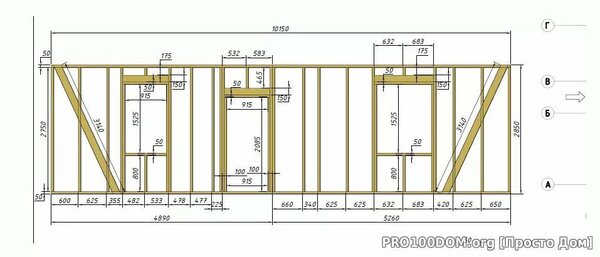Вертикальные стойки каркаса: 2х10м + 2х8м = 36м. Их устанавливают с шагом 0,5м. В местах расположения окон расстояние будет не менее 1,2м. На стойке понадобится 4 м3 бруса. Чтобы соединить основание каркаса с финишным соединением нужно 3м2 бруса. Для обшивки стен требуется 4,65 м3 обрезной доски длиной 3 м, толщиной 25мм, шириной 150мм.