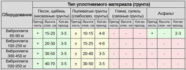 В таблице далее представлена пригодность вибрационных плит различной массы для трамбовки разных материалов.