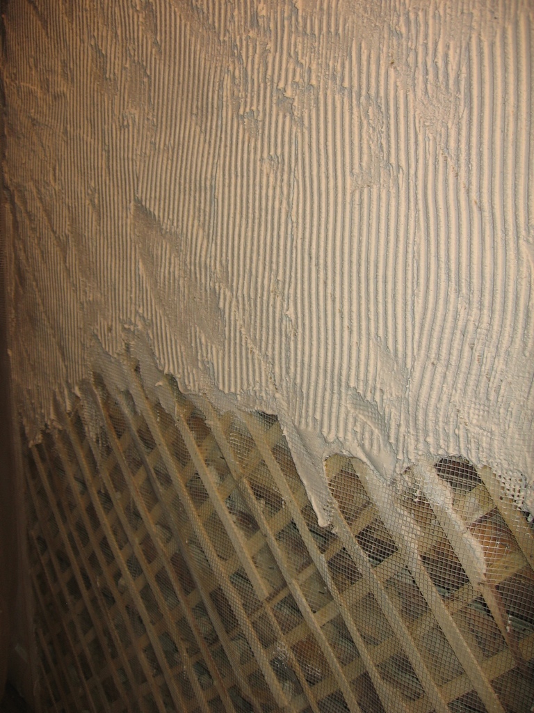 Специальная сетка между стеной и слоем штукатурки обеспечивает наилучшее сцепление смеси с поверхностью стены