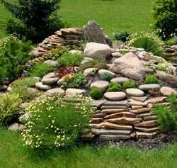 - Основная опорная конструкция горки выкладывается после окончательной усадки основания. По намеченному плану строительства альпинария требуется выложить наиболее крупные камни по периметру, при этом необходимое заглубление валунов в землю составляет не менее 60% их объема. Более мелкие камни располагают так, чтобы атмосферные осадки не смогли их подмыть, иначе устойчивость горки будет нарушено. Кроме этого, нужно следить за гармоничным сочетанием различных камней, укладываемых рядом. Между камнями следует оставлять свободное место для посадки декоративных растений.