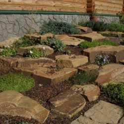 Террасная альпийская горка на даче не может обойтись без ступеней. Их сооружают между террасами из того же вида камней, что и основа альпинария. Камни для ступеней должны быть высотой около 12 см, а шириной около 40 см с плоской поверхностью. При укладке оставляют небольшие щели (около 4 см), которые засыпают землей. Следует очень внимательно отнестись к их укреплению, хорошо прижимая по бокам фундаментом из камней.