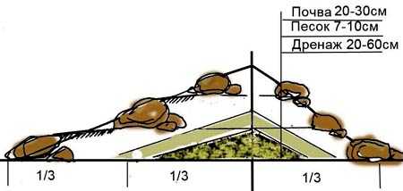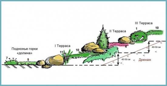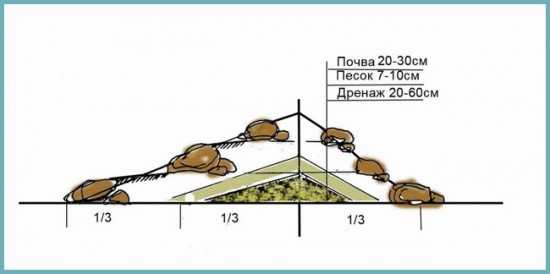Схема и подробный план, по которому будет создаваться альпинарий, должны учитывать, что строительство горки выполняется на высоте от 1 до 3 м.