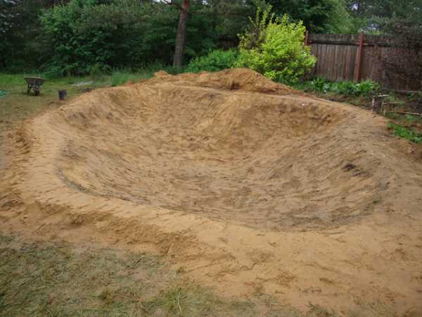 - В готовый котлован засыпают слоями щебень, гальку или кирпичный бой на минимальную высоту 0,3 м. Слой засыпки нужно полить водой, чтобы она осела. Поверх гравия насыпают 5–10 см песчано-гравийной смеси, затем её также поливают водой и тщательно утрамбовывают.