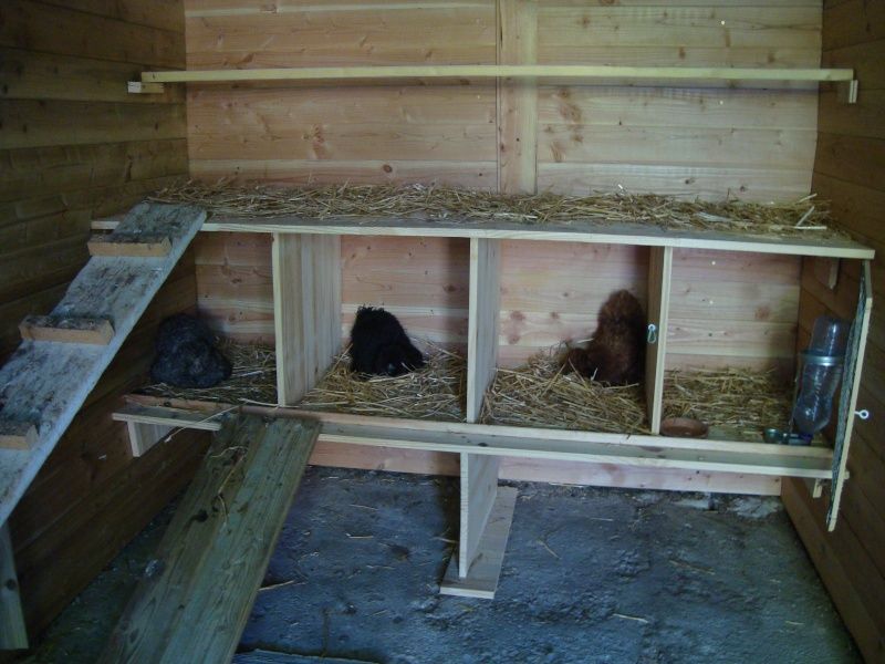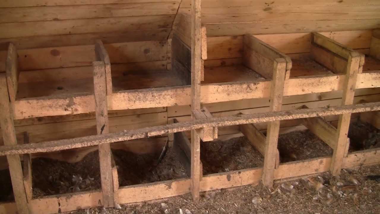 - Мебель: Цыплята спят, стоя на жердочке. Шест или 2х4 с закругленными углами в нескольких футах над полом создают удобную конструкцию для сна. Куры предпочитают откладывать яйца в гнездовых ящиках, в которых также содержатся яйца в чистоте. В курятниках должно быть не менее одного гнезда на четырех птиц. Многие небольшие курятники имеют распашную дверь, что позволяет собирать яйца, не заходя в курятник.