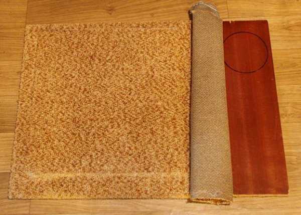 Будущий домик будет располагаться на специальной платформе. На подходящий кусок древесины (примерно 40х120) наклеивается лист поролона (40х70). Сбоку от него должно быть достаточно места для трубы, из которой будет сделана когтеточка. Место отмечают окружностью.