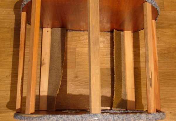 - Всю зону лежака обклеивают тканью поверх поролона. Лучше дополнительно закрепить её мебельным степлером.
