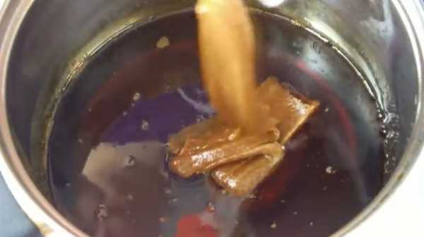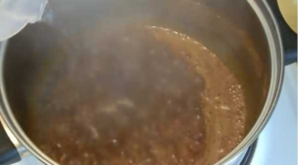 2. Как только цвет станет насыщенно-коричневый влейте 1 стакан кипятка. Все будет шипеть и бурлить, мешайте и продолжайте варить, внесите оставшийся сахар. Не забывайте постоянно помешивать, варите примерно 4 минуты.