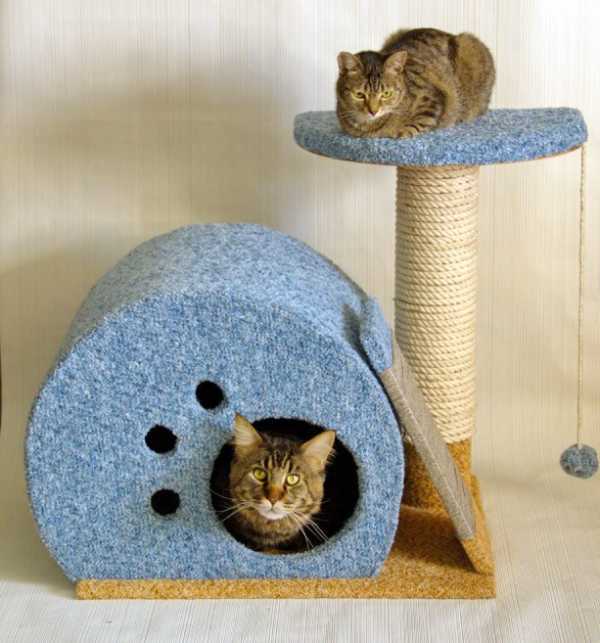 Для большинства животных подойдёт форма коробки, но, например, сиамские и бенгальские кошки предпочитают нечто вытянутое вверх. Для них можно создать дом цилиндрической формы, например – в виде имитации ствола дерева.