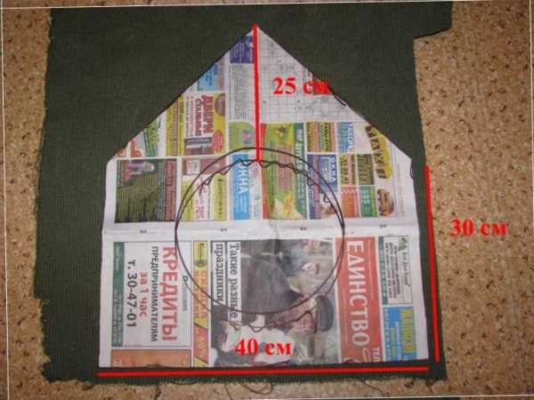 2. Изготовление выкройки. Для выкройки вам понадобиться шаблон. Его можно сделать из газеты, сложив ее, таким образом, как это показано на рисунке 2. При этом ширина шаблона должна составлять 30 см, длина – 40, а высота будущей крыши – 25 см. прикладываем шаблон к лоскутам ткани и переносим рисунок на ткань, оставляя запас по 2 см со всех сторон. Таким способом вырезаем 8 деталей, размером 40х30х25 – это будут стены нашего домика и 2 фрагмента 40х40, которые будут выполнять функцию днища. На лоскуты, которые призваны служить в качестве стен, лучше наносить рисунок на лицевую сторону, используя мыло или мел.