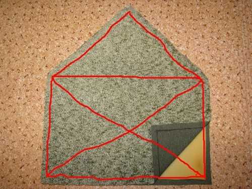 - После этого можно переходить к внешней отделке. Реально воспользоваться, например, кусочками ковролина. Переднюю часть можно приклеить целиком и лишь затем прорезать вход. У каждого кусочка стоит оставить около сантиметра, чтобы загнуть его внутрь.