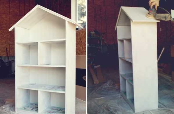 - Снимите полки и прикрепите их так, чтобы получилось нужное количество этажей в домике. Для крепления полок используйте столярный клей и шурупы либо гвозди без шляпок.