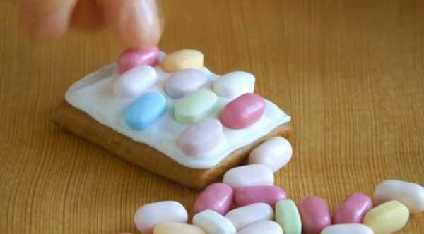 8. С внутренней стороны рамы окна обведите глазурью для рисования. И затем приклейте два кусочка мармелада. Оставьте сохнуть мармеладом вверх.