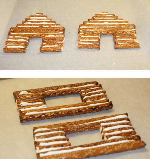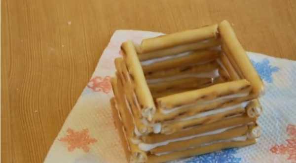 13. А теперь еще можно сделать колодец из сладкой или соленой соломки. Длина палочек 3-4 см, при сборке чередуйте палочки, чтобы стенки колодца не были дырявыми.