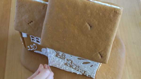 2. Стены приклейте встык встык глазурью для росписи. В качестве подпорки используйте любые подходящие по высоте предметы, например стакан.