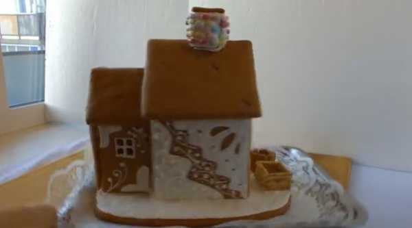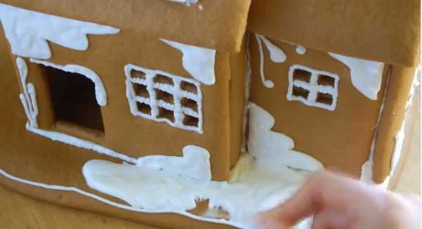 Как он классно выглядит, особенно если вы его испекли под Новый год или на Рождество Христово, ведь его можно оформить в зимнем стиле, а это значит что на крыше будет лежать снег, а на окнах можно нарисовать узоры.