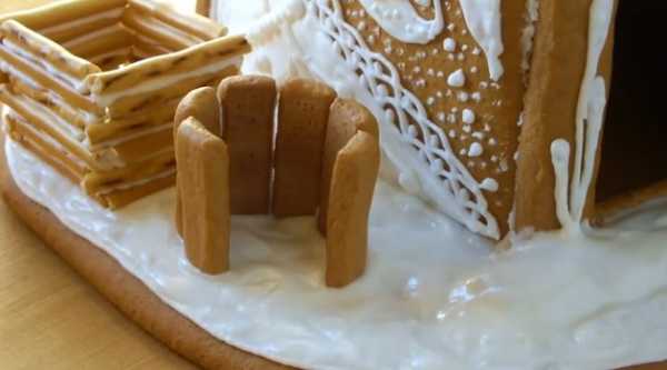 6. Можно залить глазурью почти всю поверхность. Установите в угол колодец и также емкость для воды, можно выпечь маленькие полоски печенья заранее.