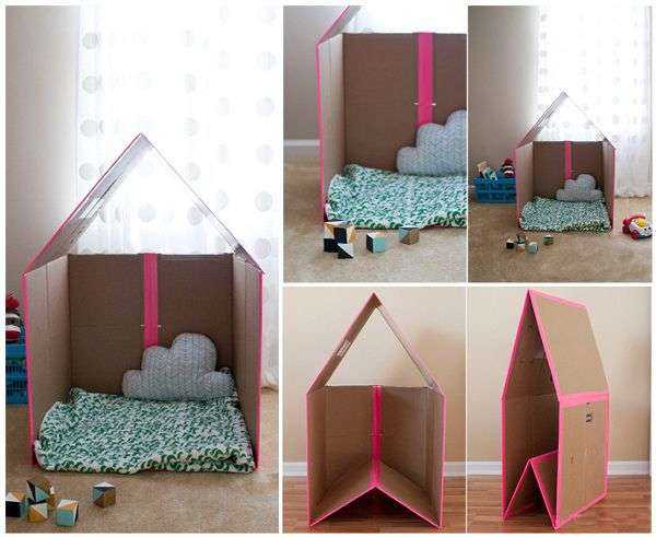Такие оригинальные решения требуют минимума усилий. Стоит рассмотреть ещё один несложный домик, отлично подходящий для кота, но здесь уже придется воспользоваться ножницами, клеем и некоторыми другими материалами. К работе вполне можно приобщить детей.