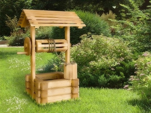 Вот мы и подошли к наиболее интересному и творческому процессу строительства – сооружению оголовка – надземной части, возвышающейся над поверхностью на 0,6-0,8 м. Проще всего оголовок сделать из тех же бетонных колец, которые использовались для шахты колодца. Так как бетон выглядит не слишком декоративно, можно обложить его бревнами или брусом, создав имитацию деревянного сруба. Сделав простейший сруб, можно возвести колодец декоративный своими руками – сооружение, предназначенное не для получения воды, а для красоты. В этом случае шахта не роется, а сооружается только сруб, имитирующий настоящий действующий колодец. Для стоек можно взять брус, сечением около 10х10 см. Нагрузка на них не слишком велика, поэтому крупные стойки не обязательны.