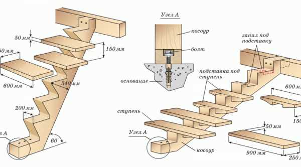 Лестница, изготовленная по такому варианту, имеет своим недостатком громоздкость, однако проста и требует для изготовления минимум инструментов (если к внешнему виду не применять высоких требований, можно вообще обойтись ножовкой и молотком). Однако иногда сделать лестницу на второй этаж жилого дома хочется поизящнее. В этом случае применяют схему не с накладными, а с врезными ступенями. Разметка при этом будет выполняться так же, как и в первом варианте. А как такая лестница и ее узлы будут выглядеть, можно увидеть на рисунке ниже.