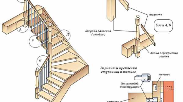 Перед тем как сделать лестницу, точнее собрать ее в единую конструкцию, выполняем примерку деталей и при необходимости их подгонку. После того как все детали изготовлены и подогнаны, зачищаем их наждачной бумагой, особенно тщательно шлифуем торцы. Соединения выполняем с помощью нержавеющих шурупов, предварительно промазав соприкасающиеся поверхности клеем. В качестве клея можно использовать эмульсию ПВА либо столярный клей. Как выглядят узлы сопряжения, узлы крепления лестницы к полу и перекрытию, можно увидеть на рисунке выше.